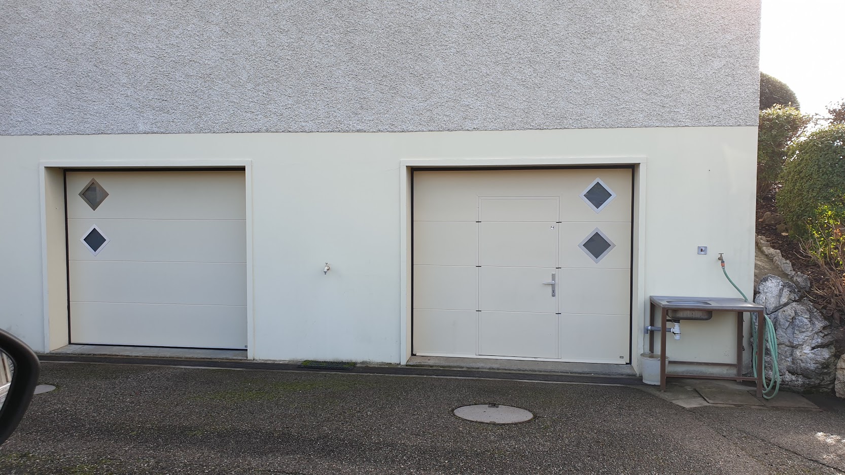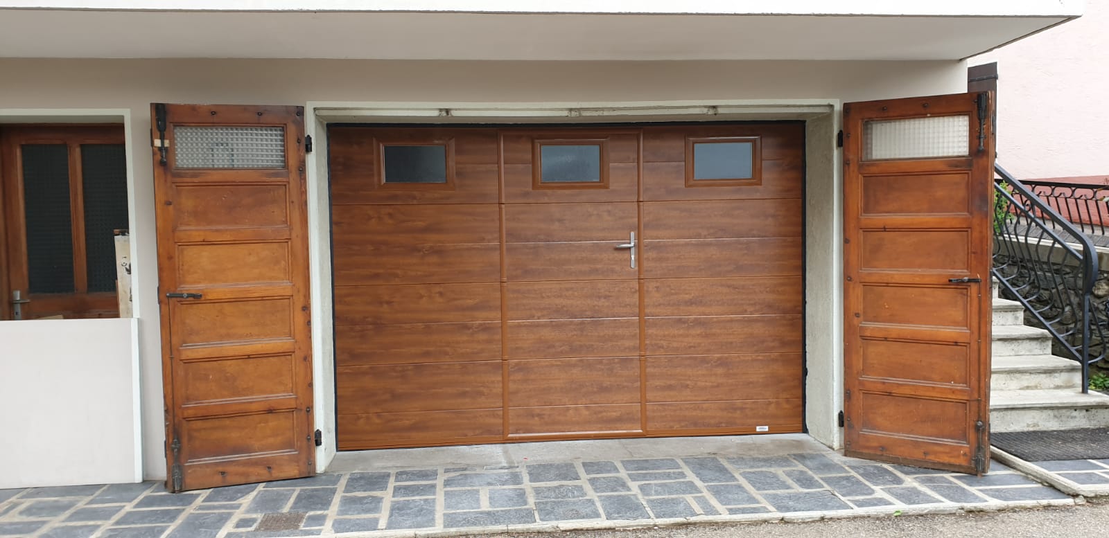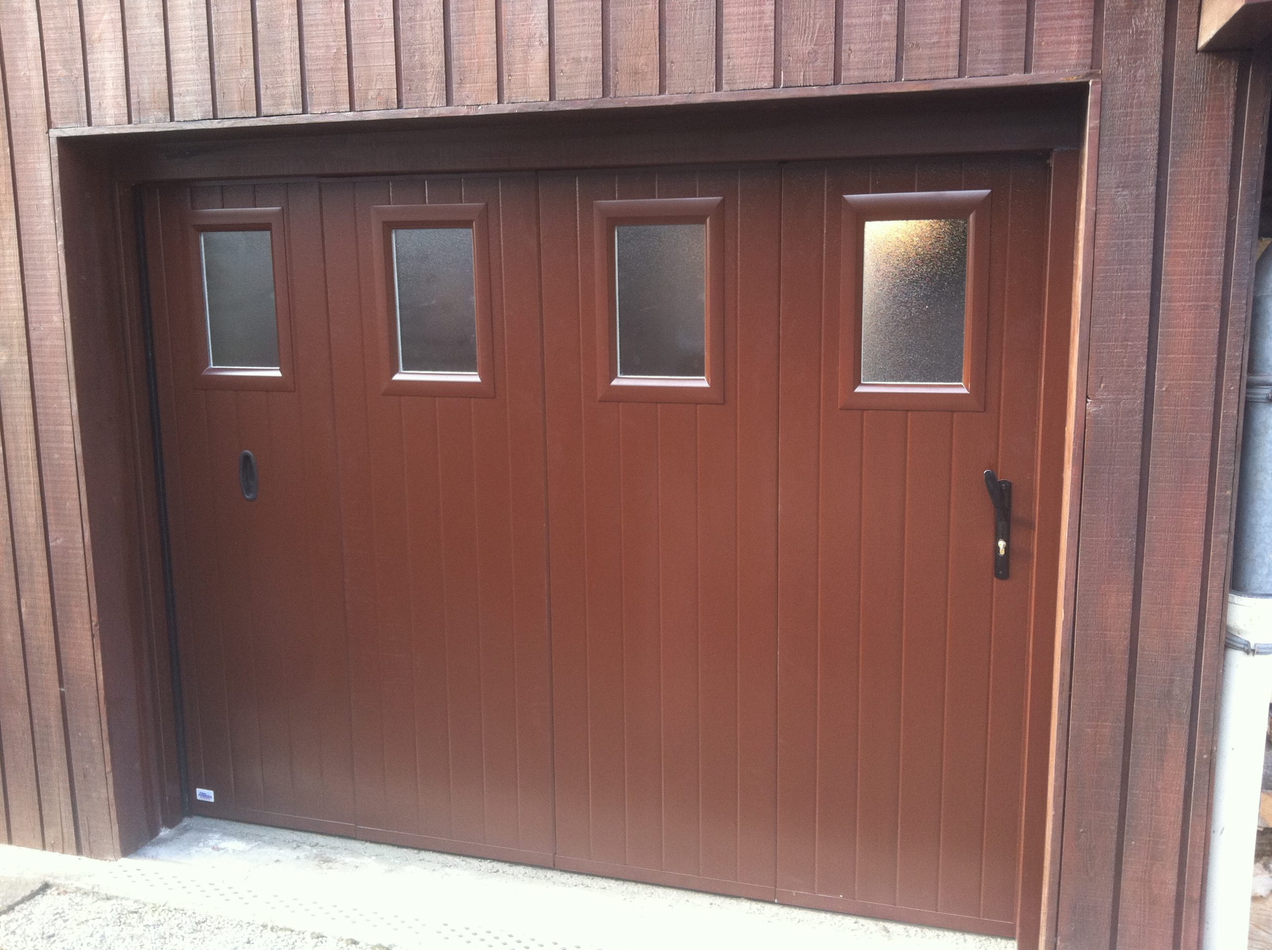 Pratique, la porte de garage battante est composée de deux vantaux, dont un semi-fixe.